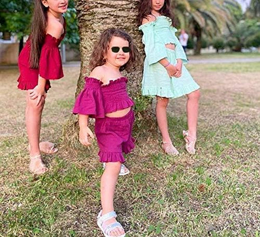 3Pcs Toddler Kids Baby Girl Summer Outfits off Shoulder Crop Top Ruffle Shorts Headband Clothes Set 1-6Y (Rose Red, 5-6T)